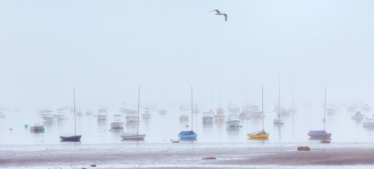 Heavy fog over Marblehead Harbor sets the stage for minimalist photography perspectives of Racer's Row.